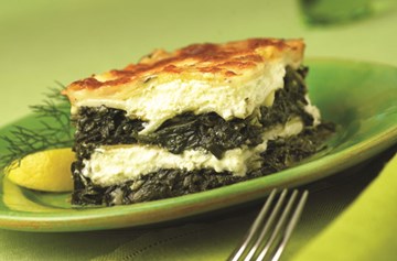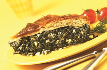 Phyllo pie filled with sautéed spinach, Greek feta, onions, spices and baked until golden.