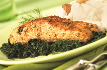 Perfectly broiled salmon on a bed of lightly sautéed spinach. Min 5 lbs.