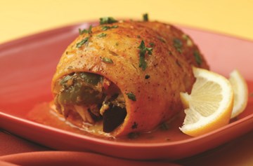 Fresh tilapia rolled and stuffed with mixed seafood, breadcrumbs, scallions, spices and baked golden brown. Min 5 lbs.